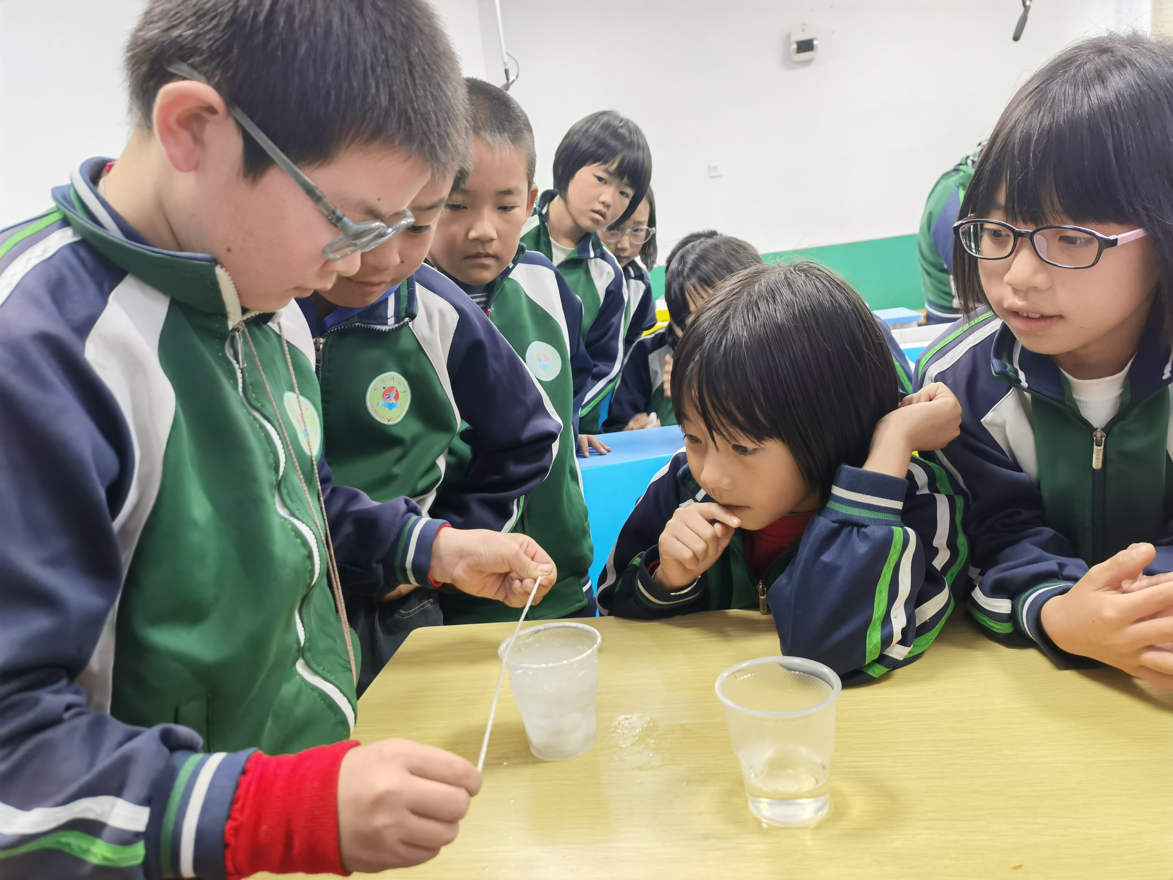 除主题讲座外,团队还特别引入了“干冰魔法秀”实验,来讲解干冰升华原理及干冰在食品保存、疫苗运输及工业清洗中的应用。实验人员将固态二氧化碳(干冰)放入量筒中与氢氧化钠(NaOH)溶液混合,随着气泡升腾,事先添加不同指示剂的溶液纷纷变色,孩子们不约而同地凑近观察,不时发出“哇!变色了!”的惊叹,当干冰与肥皂水结合吹出巨大泡泡时,全场爆发出欢呼声。